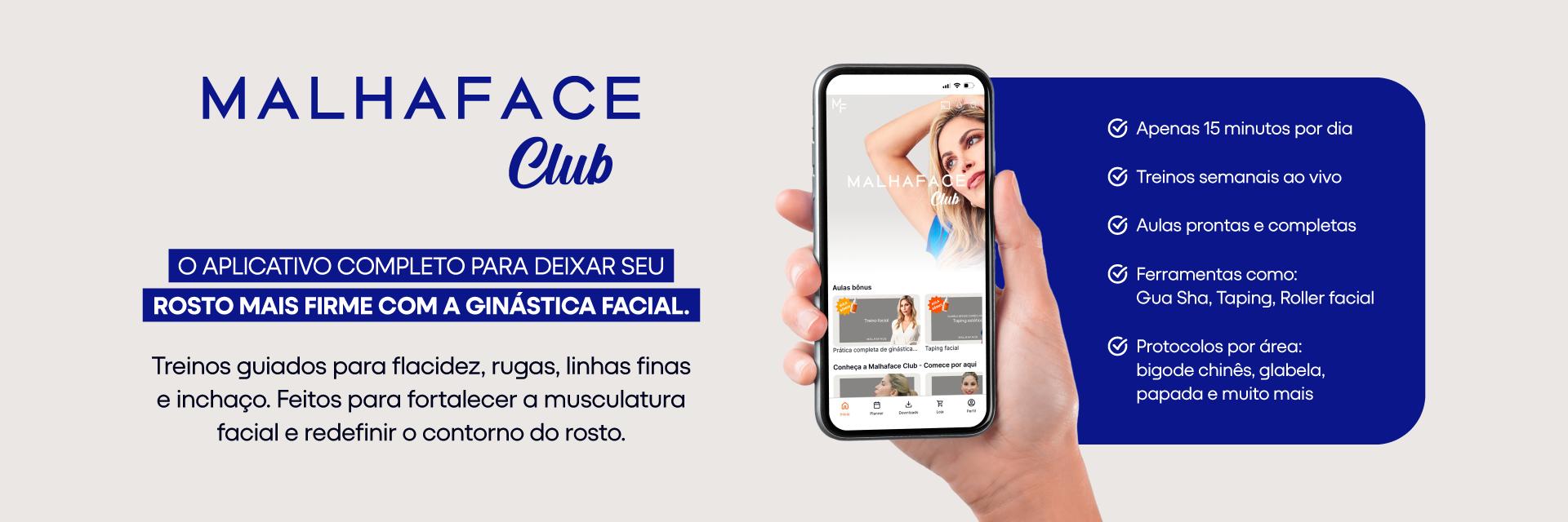 O Malhaface Club é o aplicativo de ginástica facial para você cuidar do rosto em casa, em poucos minutos por dia. São aulas guiadas para firmar, levantar, drenar e melhorar a aparência da pele.